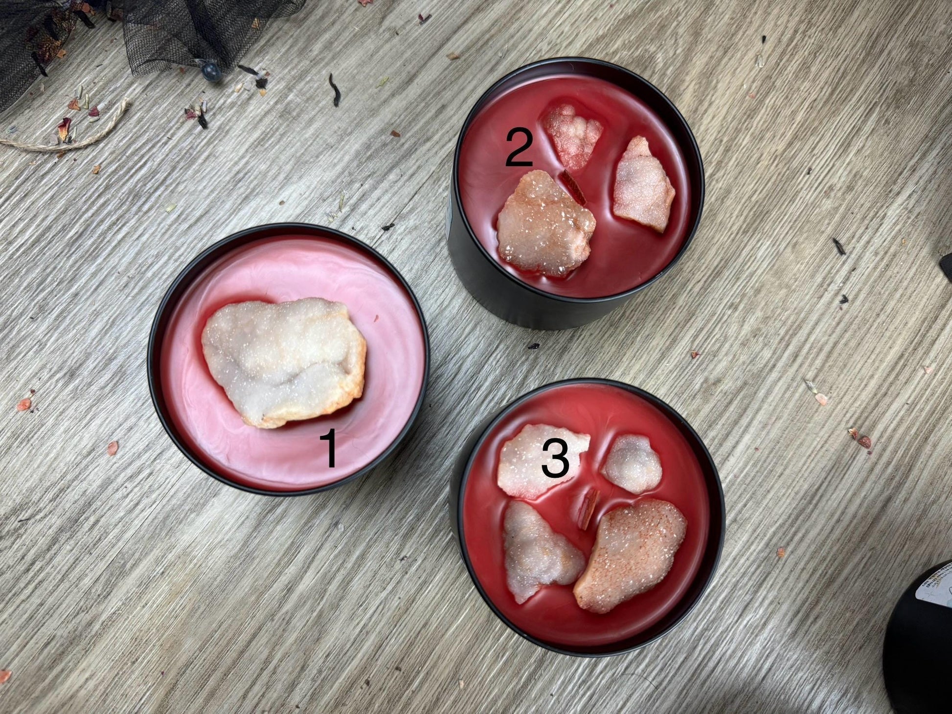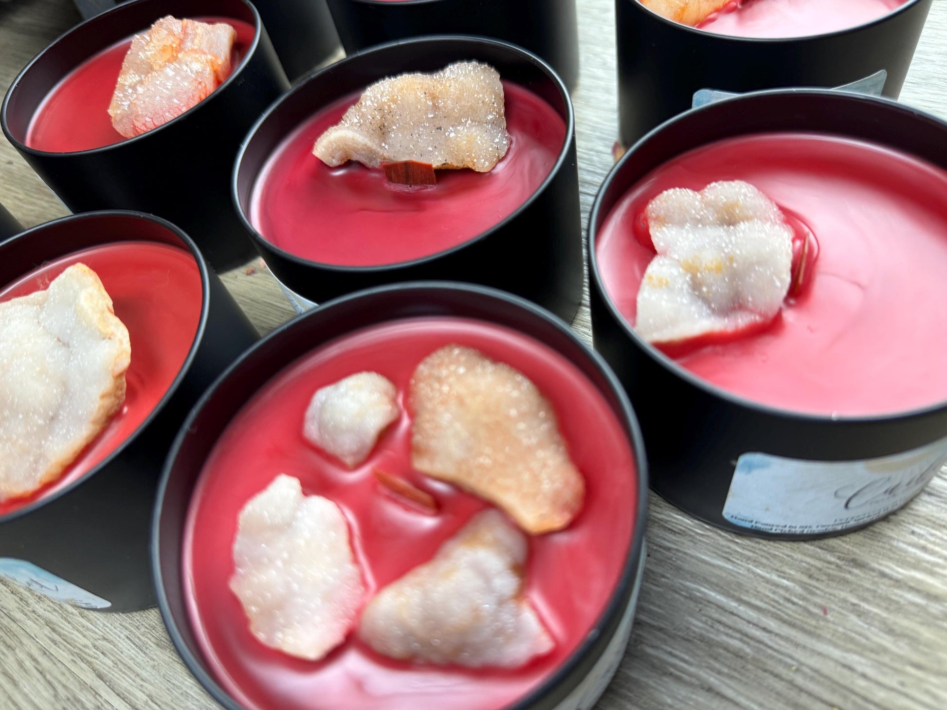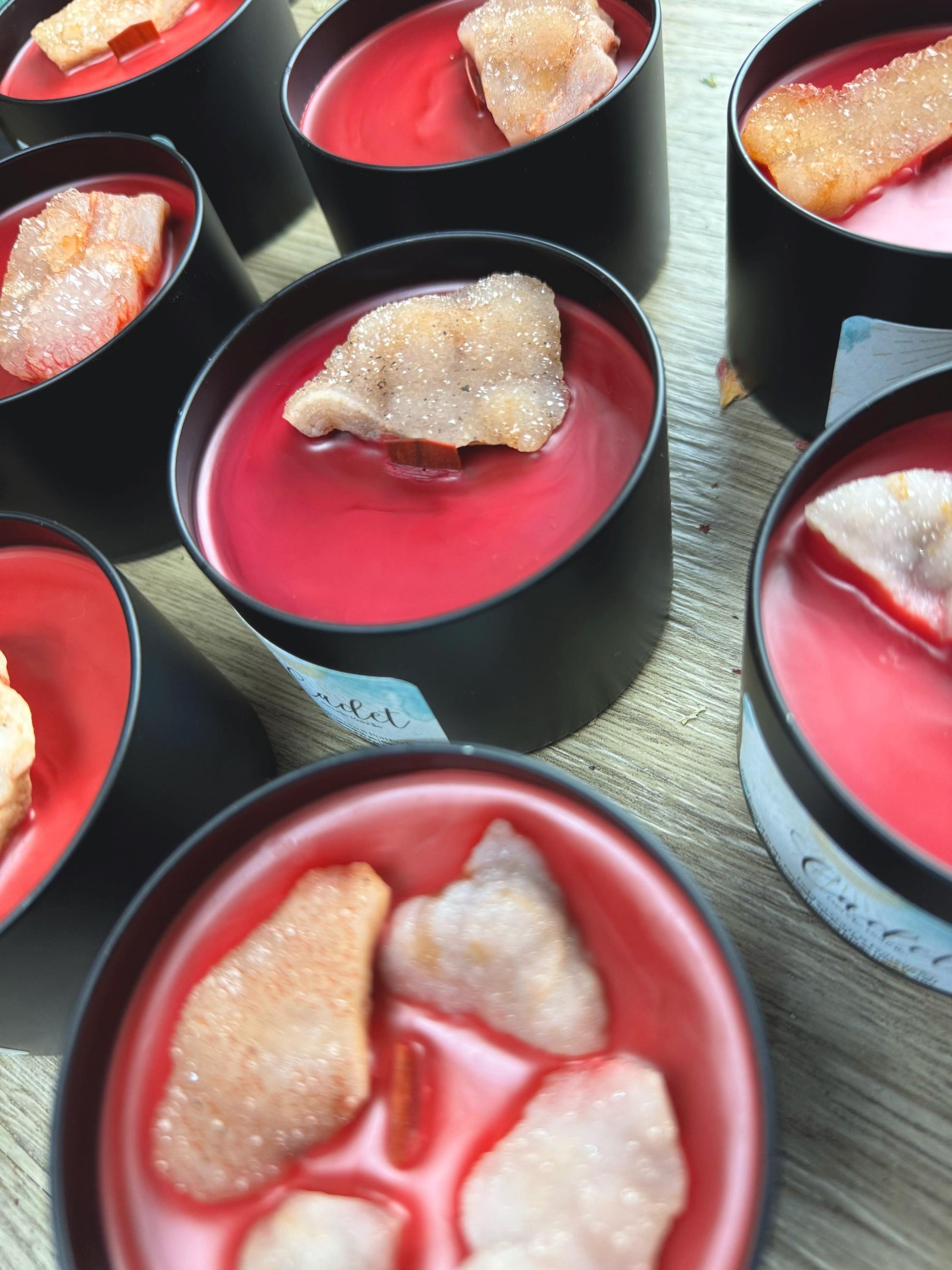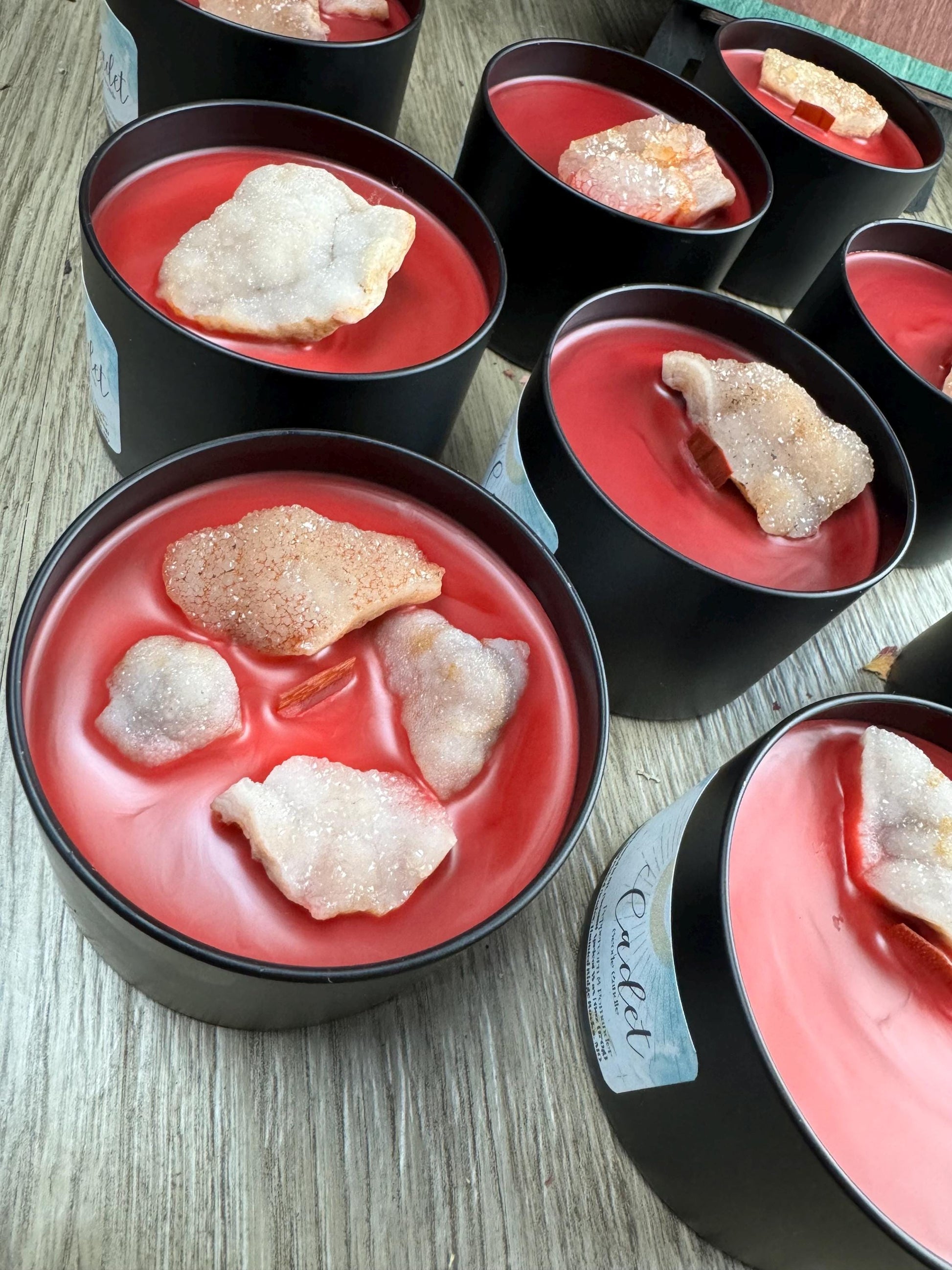 These 6oz candles are made from Luxury Coconut Apricot wax and a crackling wood wick. Each candle has a Hand dug Geode from Haunted Ridge Rocks in Cadet, MO.
