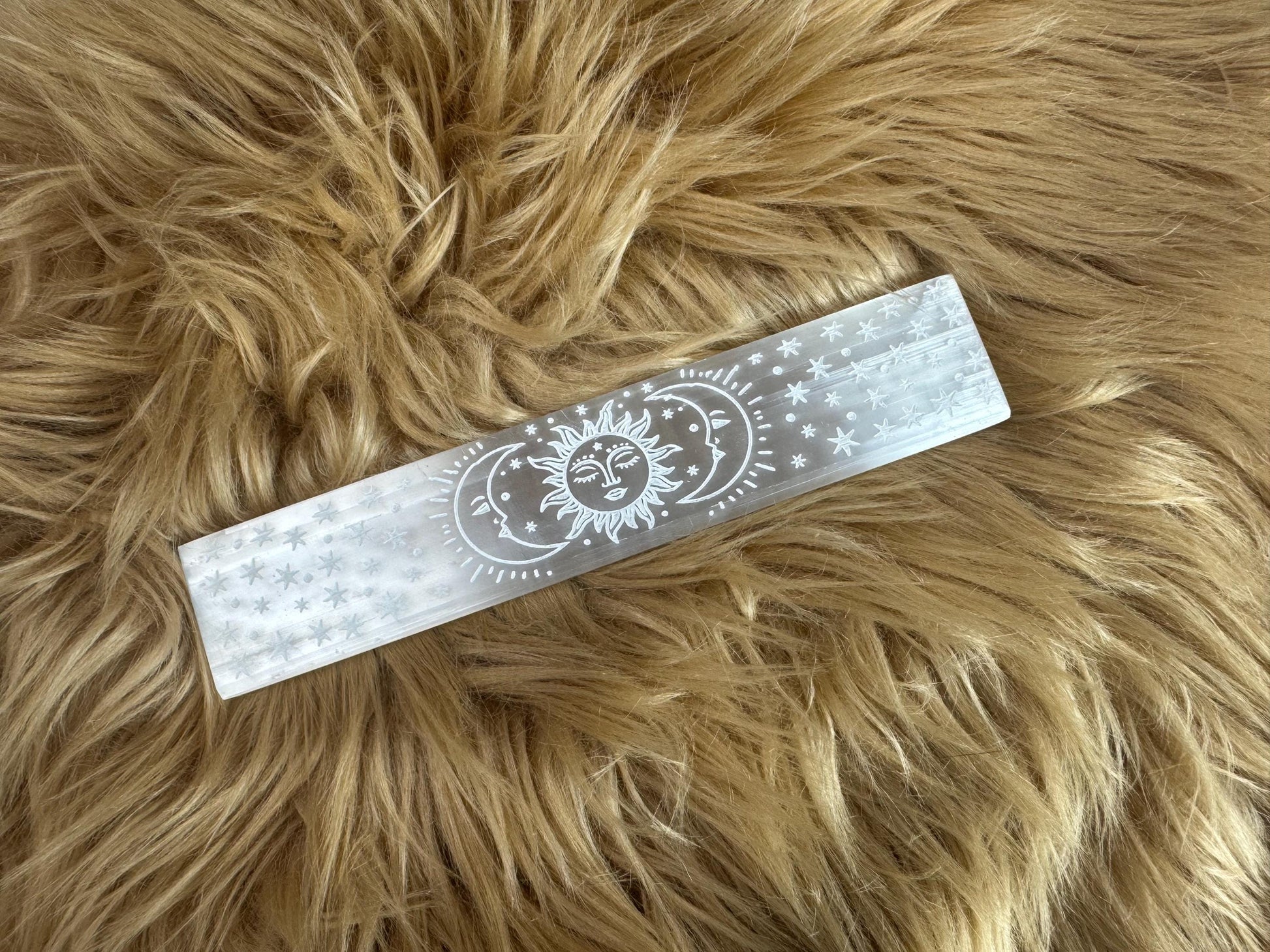 These engraved Selenite charging plates are the perfect size to charge your crystals without taking up a significant amount of space on your altar.