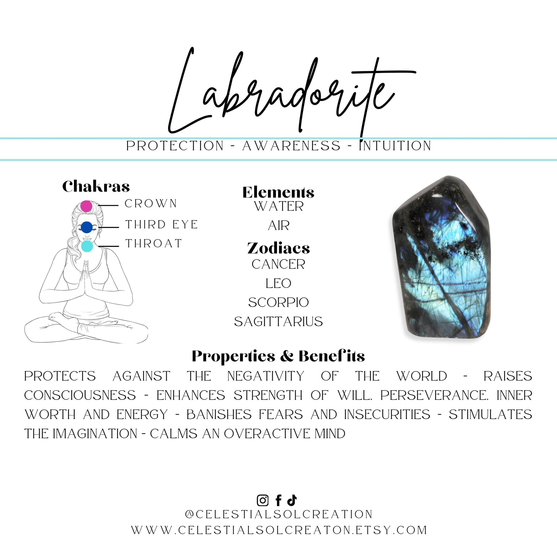 Labradorite spiritual benefits include protecting against the negativity of the world, it raises consciousness, enhances strength of will. It is known to enhance perseverance, inner worth and energy. Labradorite also banishes fears and insecurities, stimulates the imagination, and calms an overactive mind. Labradorite is also amazing for shadow work and psychic amplification!