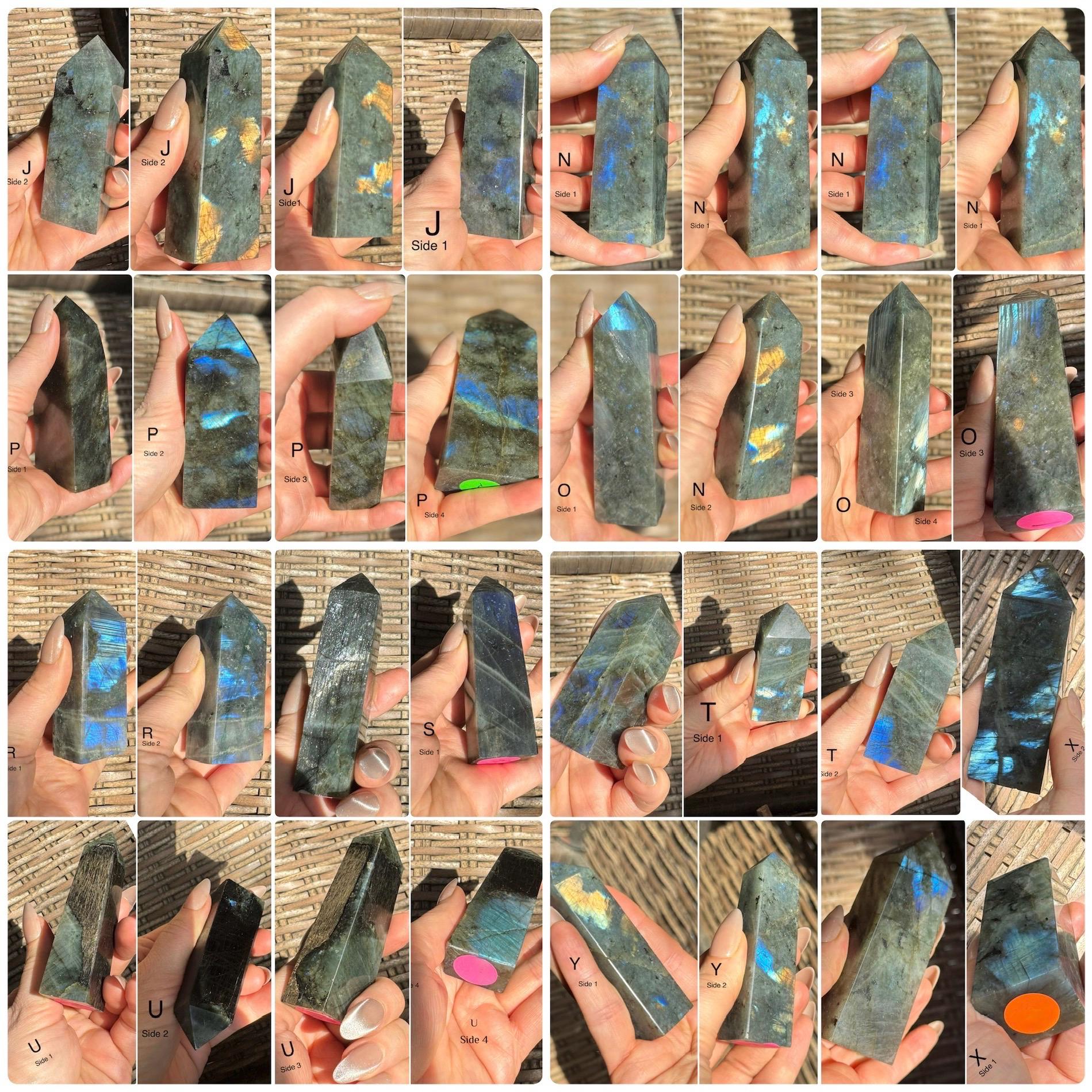 These are polished labradorite towers but they may have natural diviations, pocks, or abborrations.