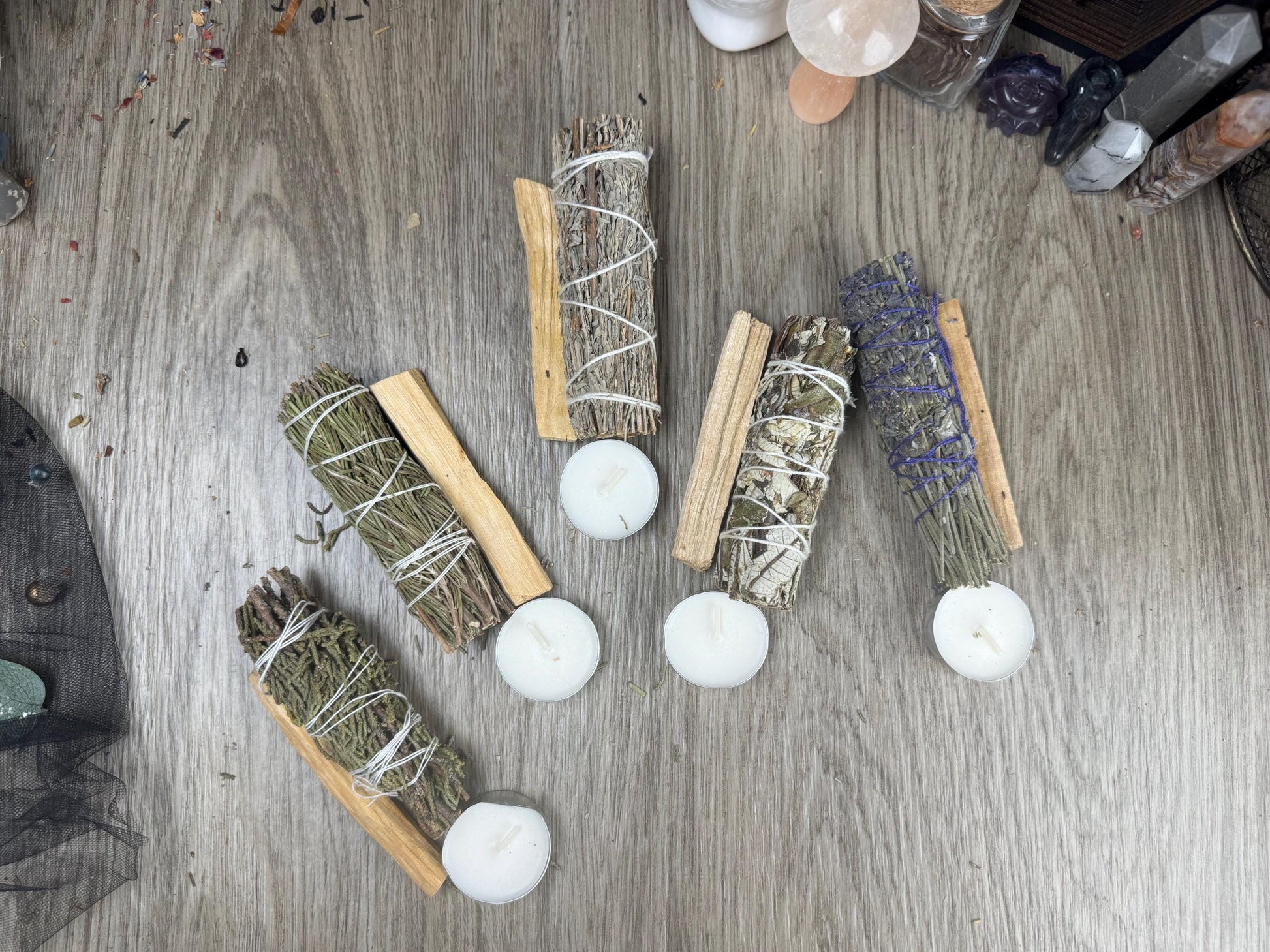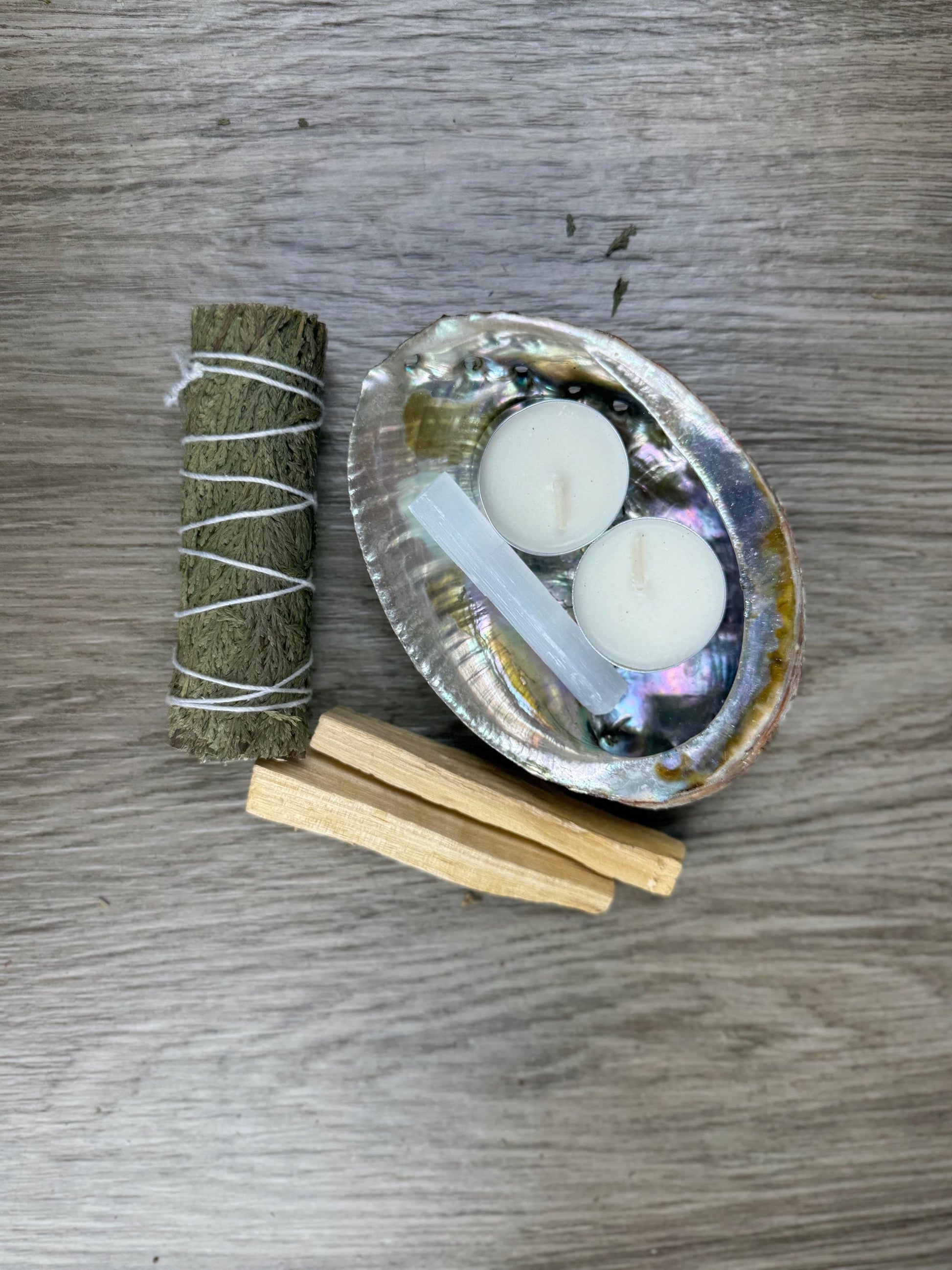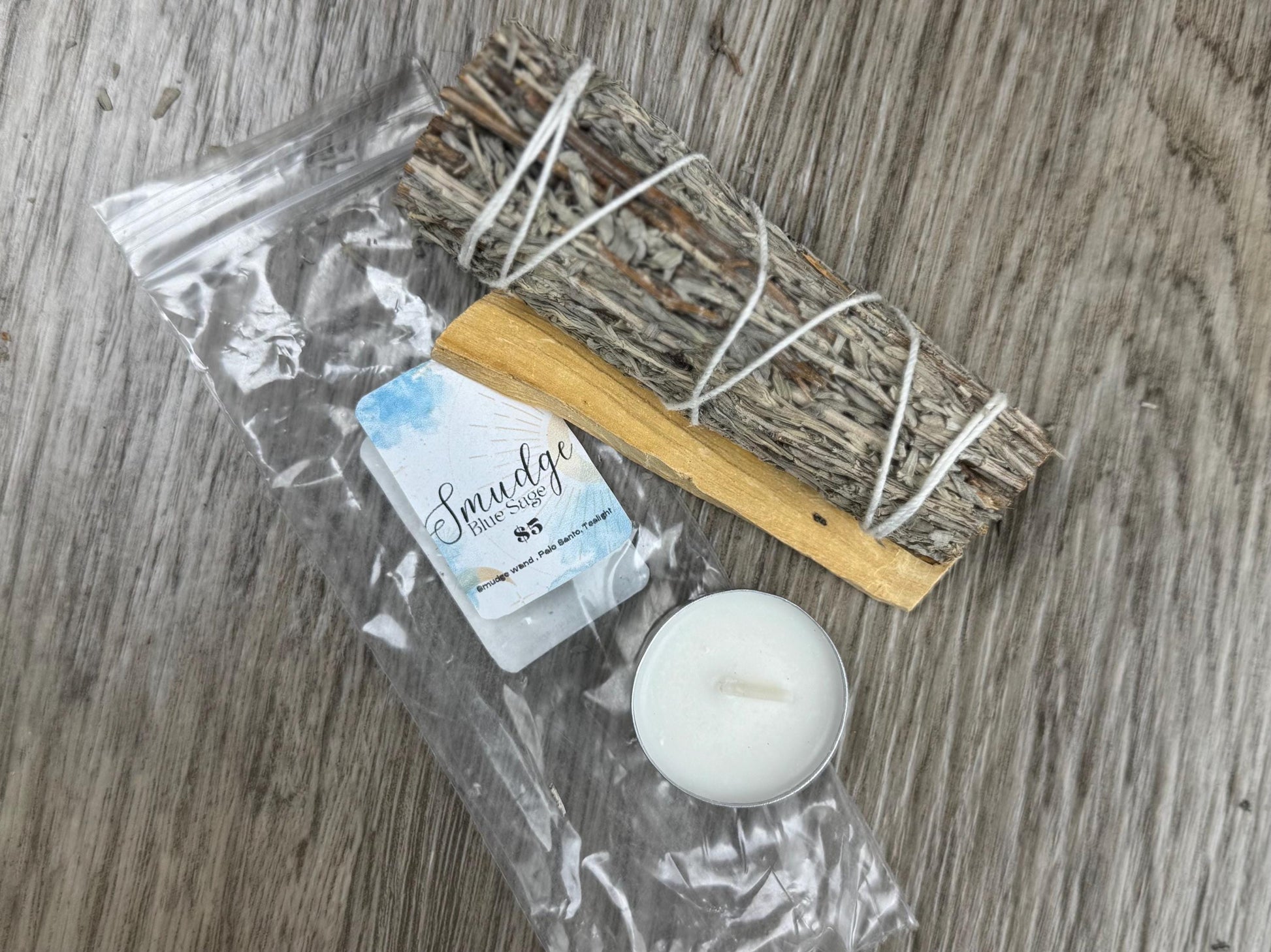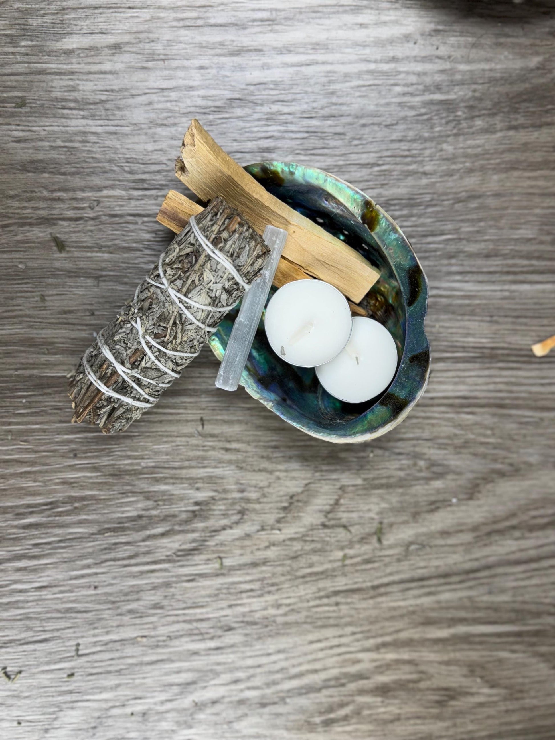 đŞSmudge Include: A Smudge Wand, A Palo Santo Stick, and a Tealight (to light your smudge and Palo Santo).