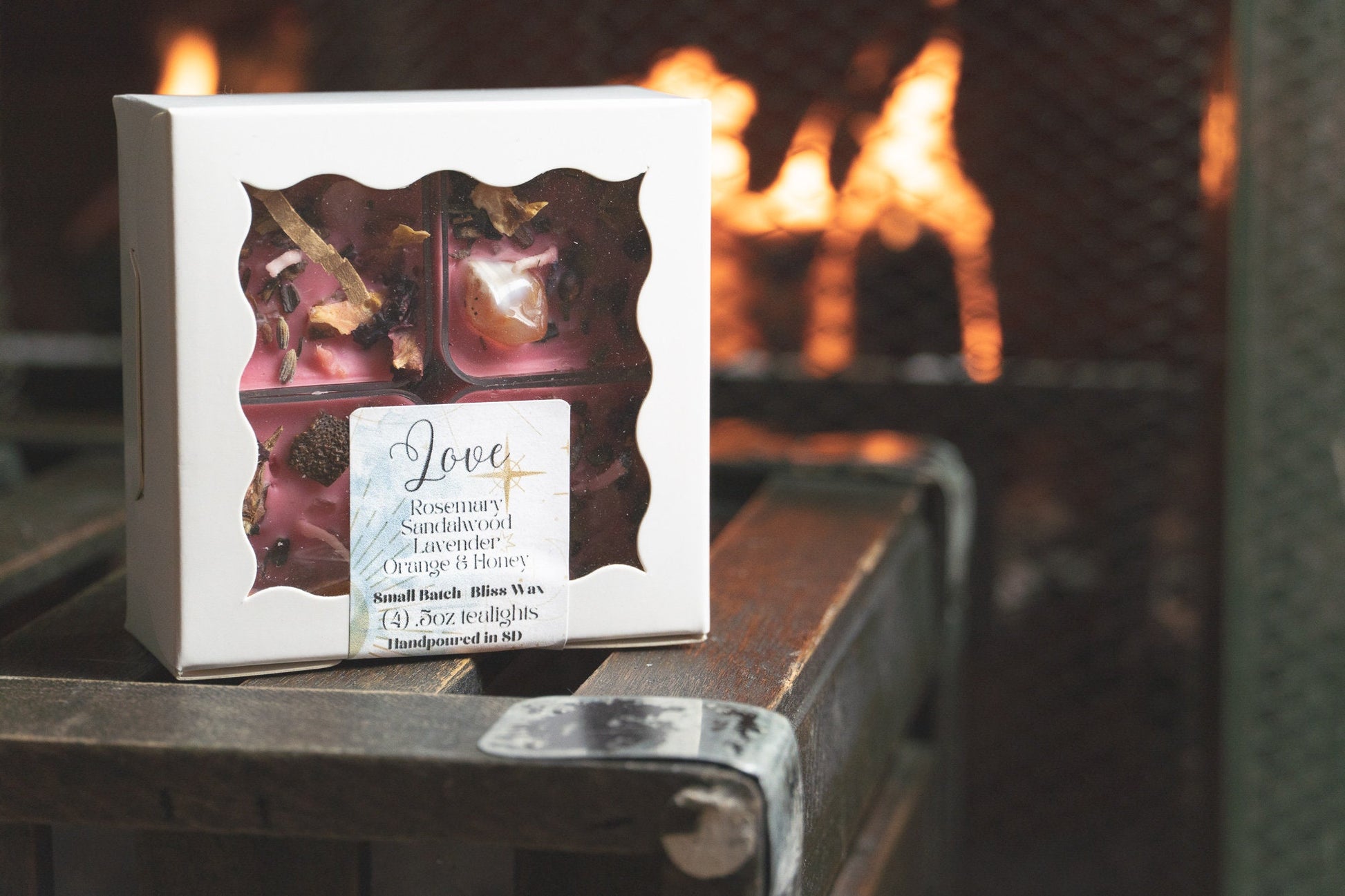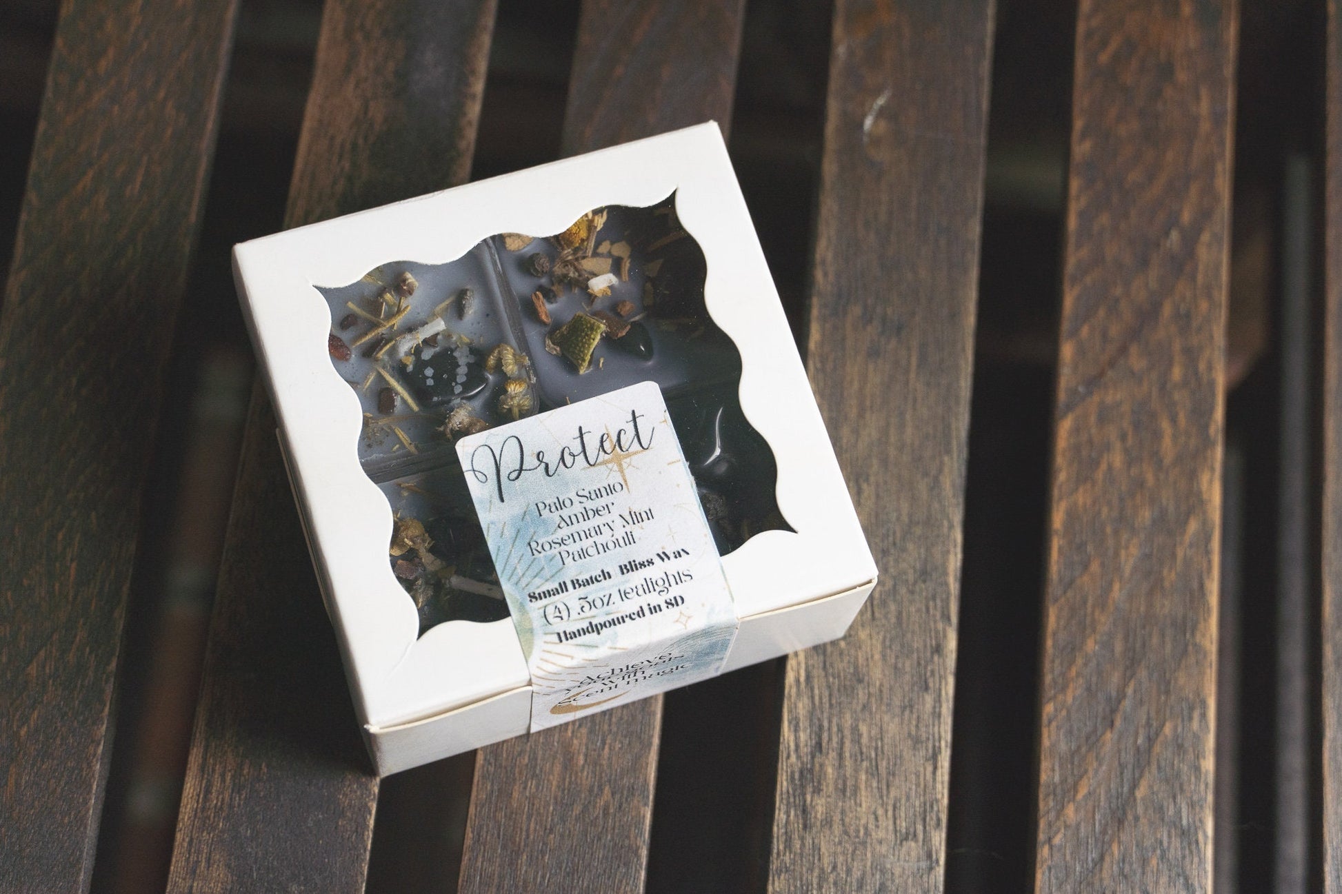 Our Tealights are dressed with herbs and crystals and uses our signature scents to bring your intentions to life! They are Square, .5oz, tealights. These unique tealights come in a box of 4.