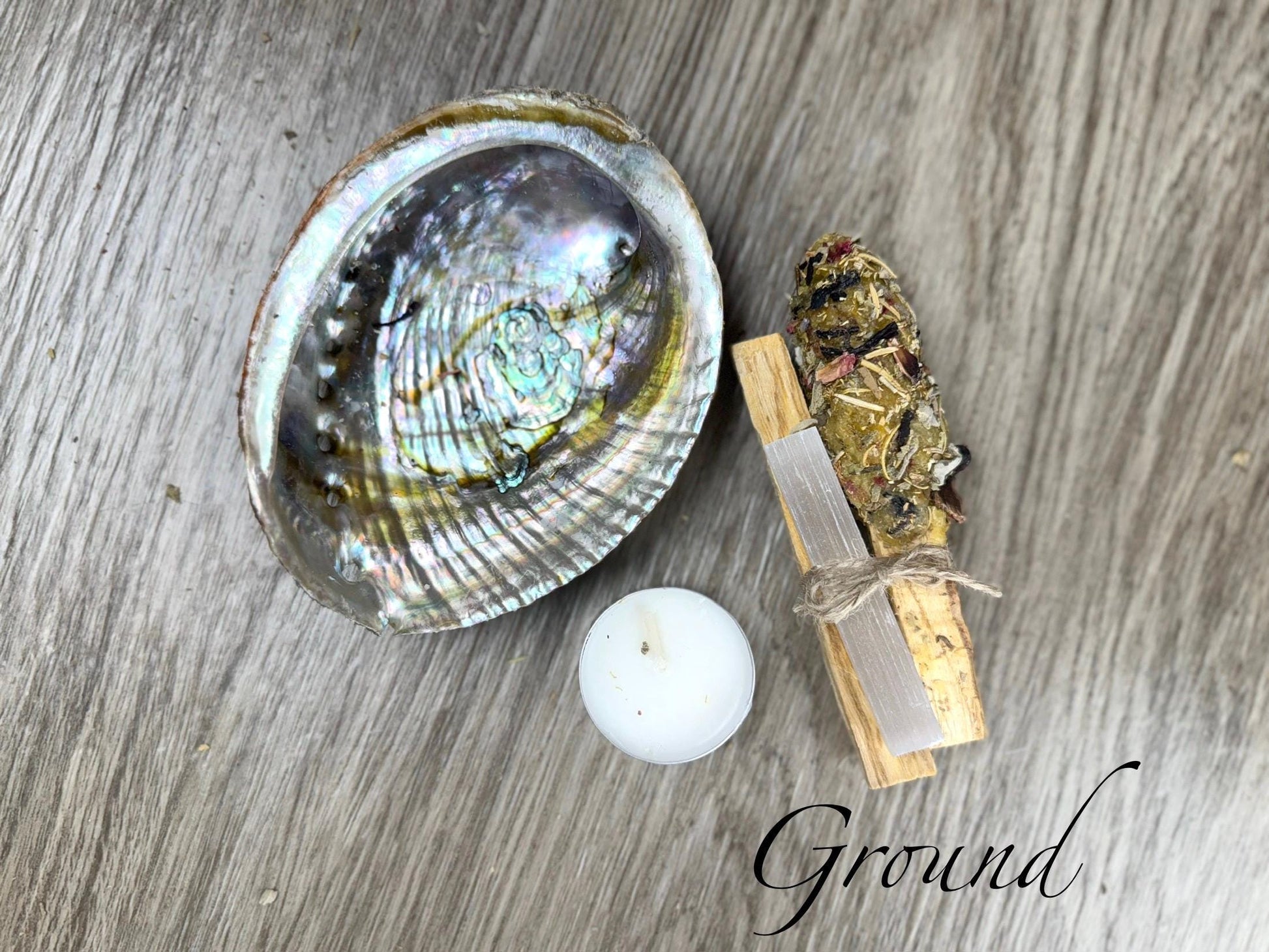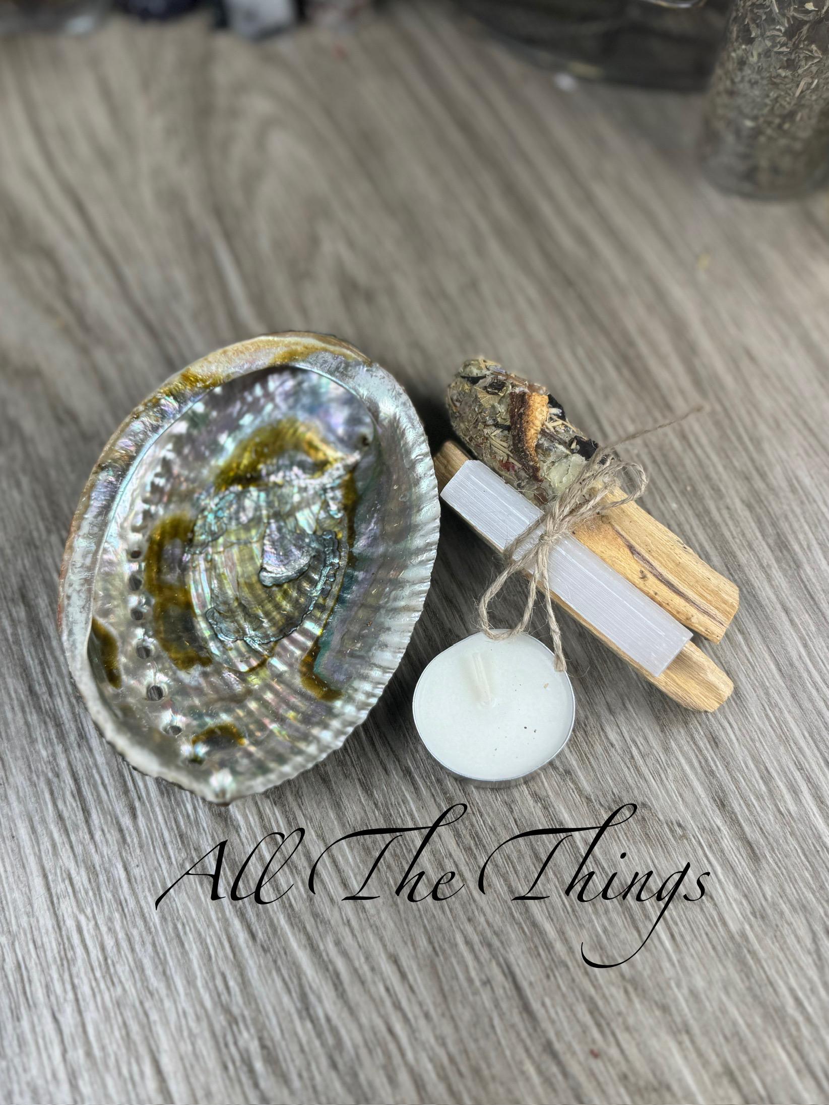 Abalone shell, 2pack: This comes with 1 Abalone shell, 1 pop, 1 palo santo and a tealight for lighting.