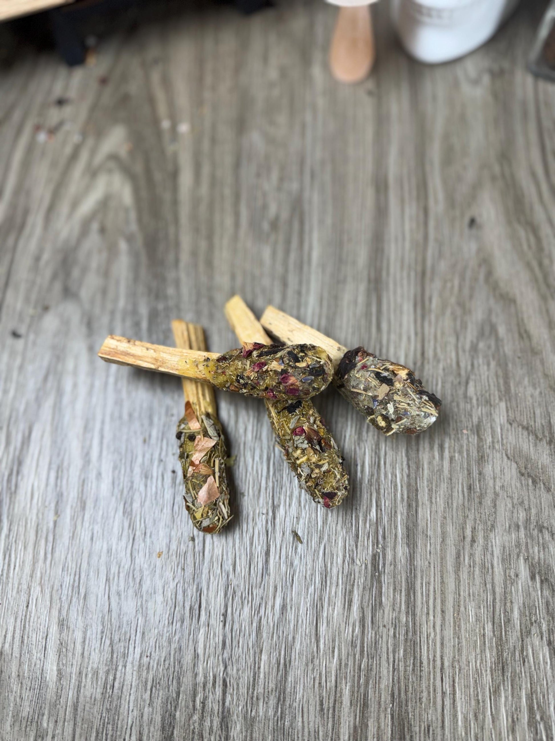 Palo Santo Smudge Pops are the perfect way to cleanse your area with a specific intent! These pops are palo santo sticks, dipped in beeswax, covered in different herbs, for each intention. Each stick is handmade, by order. All pops are made with sage, Basil, and beeswax- along with other herbs-per intention. All pops have a herbal scent and must be burned over a Dish, a burn bowl, or in an incense burner. Abalone shells available. Sticks are meant to be lit same as palo santo.