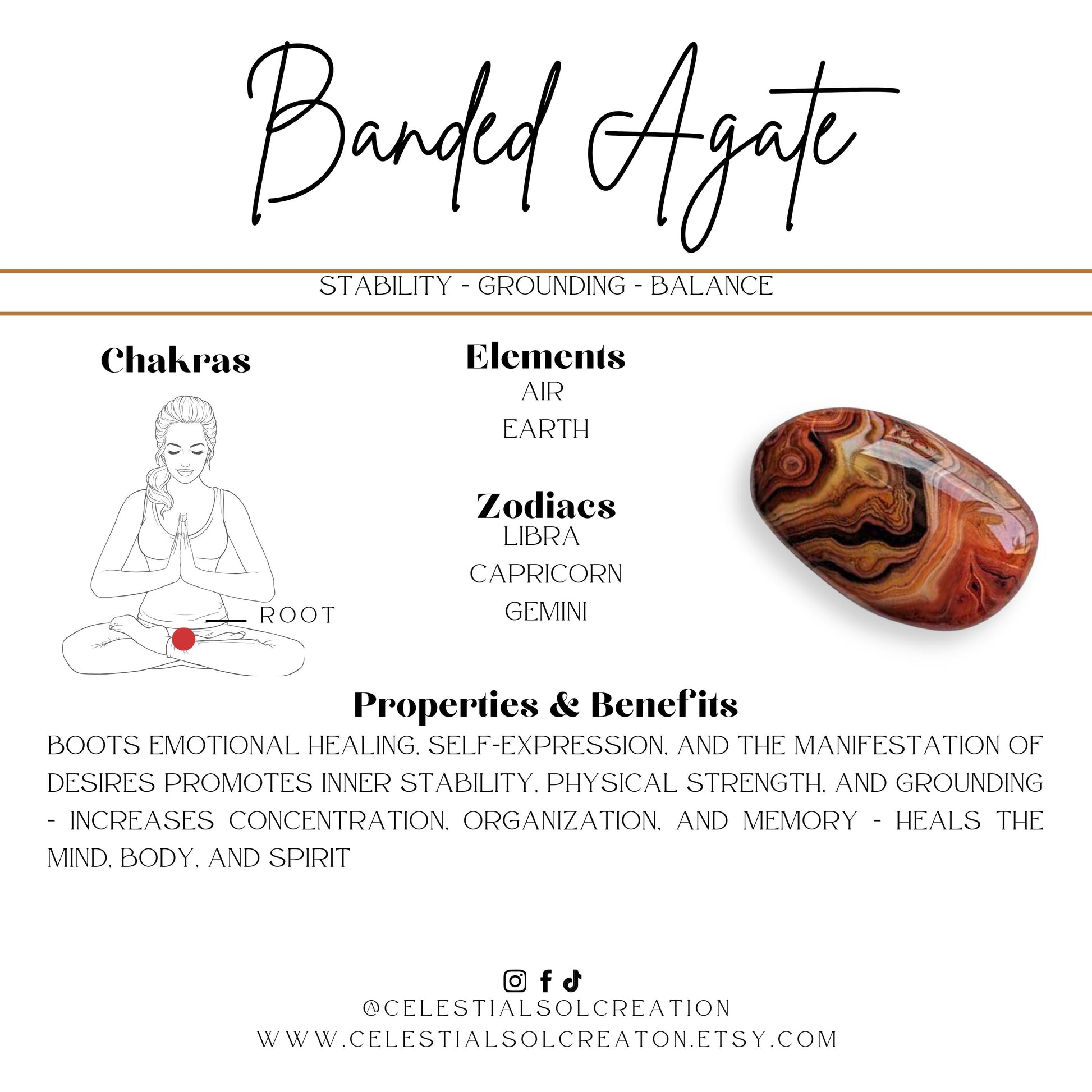 Agate is known to boost emotional healing, self-expression, and the manifestation of desires, promotes inner stability, physical strength, and grounding - increases concentration, organization, and memory - heals the mind, body, and spirit