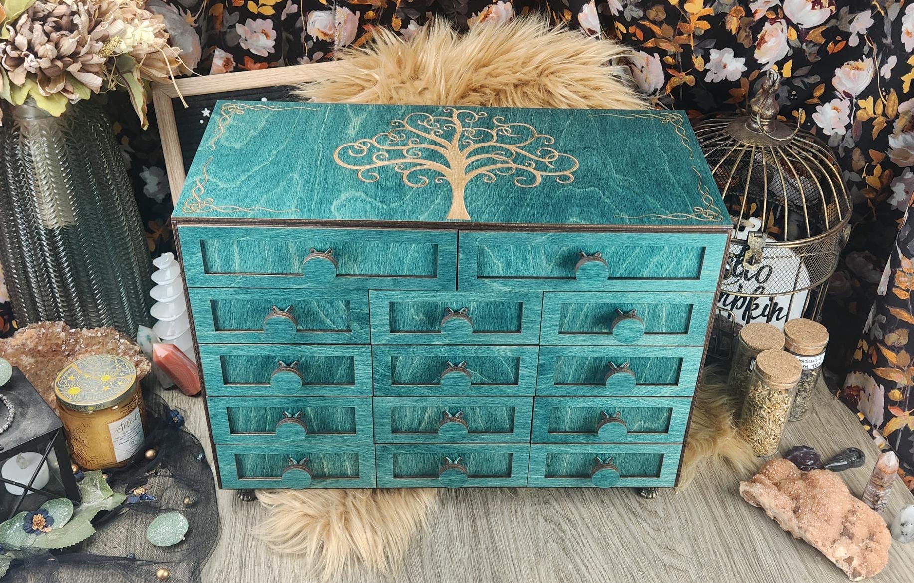 If you are looking for something with smaller drawers to fit your standard 3.3x5 inch Tarot Cards, check out our shop for our other boxes!